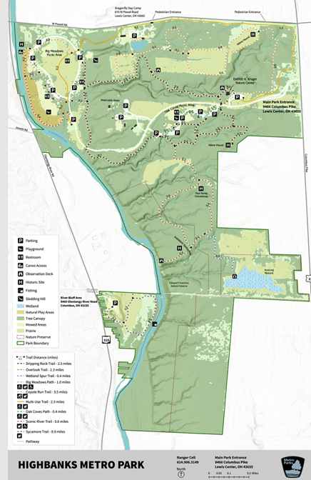 Highbanks Metro Park, located in Lewis Center, Ohio, is renowned for its rich natural and cultural history. Established in 1973, the park encompasses 1,204 acres of diverse landscapes, including dense forests, meadows, ravines, and the distinctive 100-foot shale bluffs along the Olentangy River.