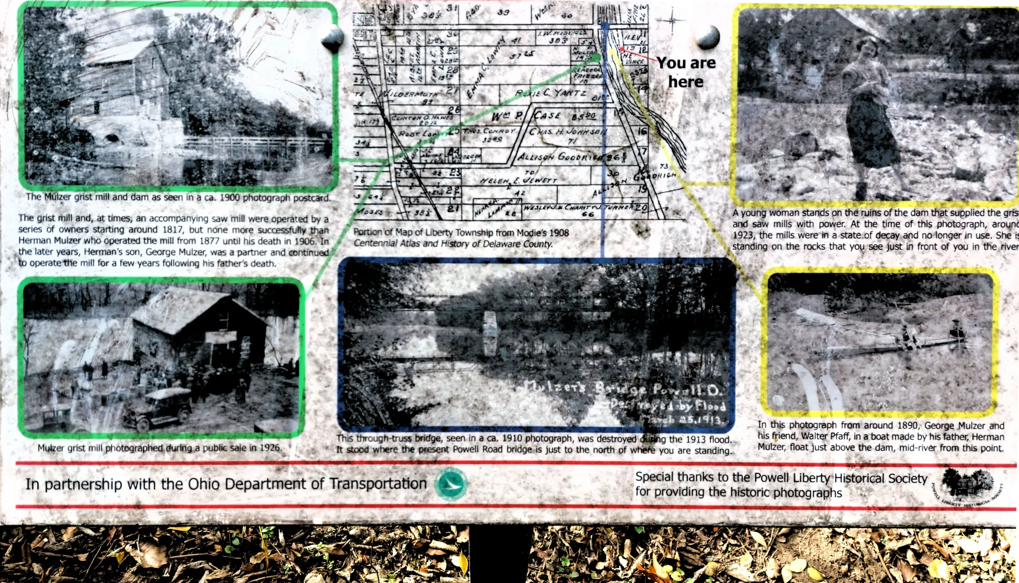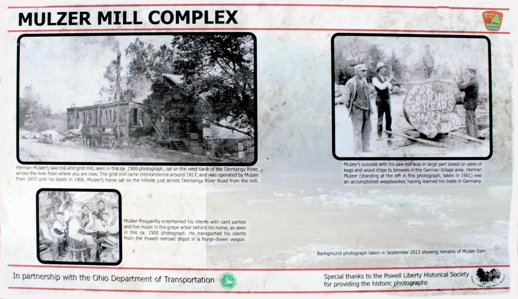 Herman Mulzer’s sawmill and grist mill, seen in this circa 1900 photograph, sat on the west bank of the Olentangy River, across from the river from where you are now. The grist mill came into existence around 1817, and was operated by Mulzer from 1877 until his death in 1906. Mulzer’s home sat on the hillside just across Olentangy River Road from the mill.
