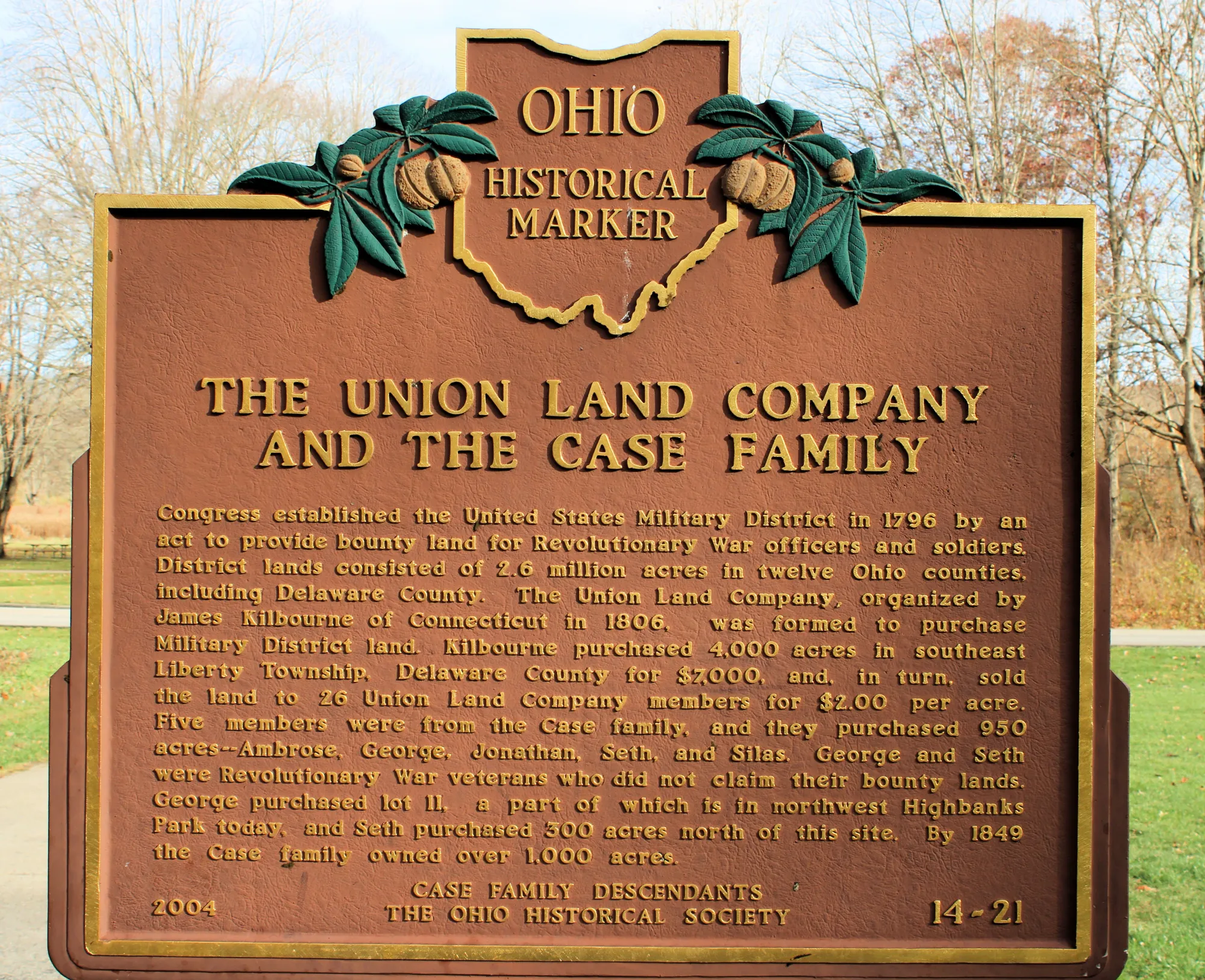 The Case family purchased 950 acres--Ambrose, George, Jonathan, Seth, and Silas. George and Seth were Revolutionary War veterans who did not claim their bounty lands. George purchased lot 11, a part of which is in northwest Highbanks Park today, and Seth purchased 300 acres north of this site. By 1849 the Case family owned over 1,000 acres.