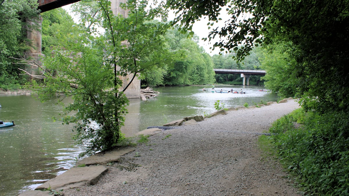 The Licking River carved this gorge through Black Hand sandstone over millions of years, and now you get to walk through it on a paved rail-trail. The gorge walls rise 100 feet on either side, and the river glides alongside the path. It's an easy, flat walk — great for families or anyone who wants scenery without scrambling. The name comes from a hand-shaped petroglyph that was carved into the rock by Native Americans — dynamited in the 1800s for canal construction, because of course it was.