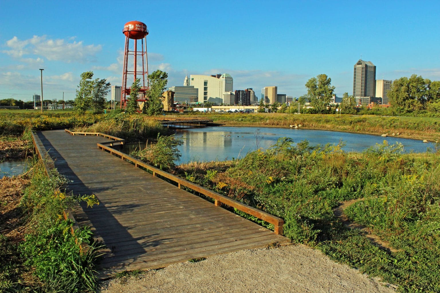 This one shocks people. You drive through an industrial area south of downtown, park next to what used to be a landfill, and suddenly you're in a birding paradise. The park sits at the confluence of the Scioto River and Big Walnut Creek, and the wetlands attract hundreds of bird species throughout the year. The trails are flat and easy — crushed gravel paths through grasslands and along the river. There's also a massive climbing wall if your kids need to burn energy. Or you do.