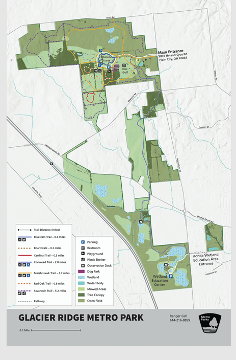 The Glacier Ridge Metreo Park was officially opened on September 22, 2002, becoming the 14th park in the Metro Parks system. The development of Glacier Ridge Metro Park was a collaborative effort between the Metro Parks and the City of Dublin. The park was designed to include nature trails, a bridle trail, picnic areas, and restored wetlands.