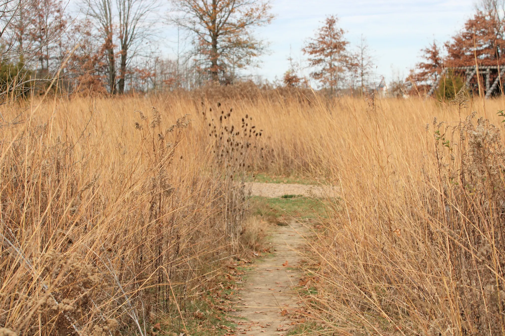 Mowed trail through the meadows and a reforested area.
