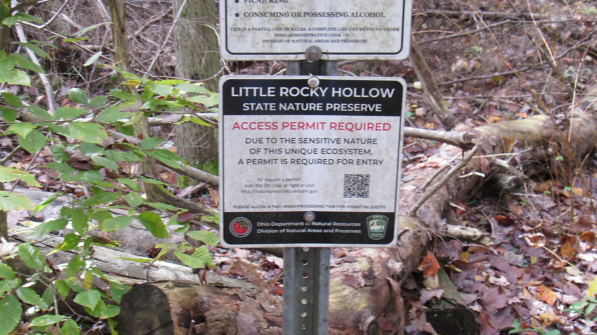 Access to Little Rocky Hollow is by permit only. Visitors must apply for and receive a permit from the Ohio DNR Division of Natural Areas and Preserves before visiting. It is recommended to submit permit applications at least 14 days before your planned visit to ensure processing time.