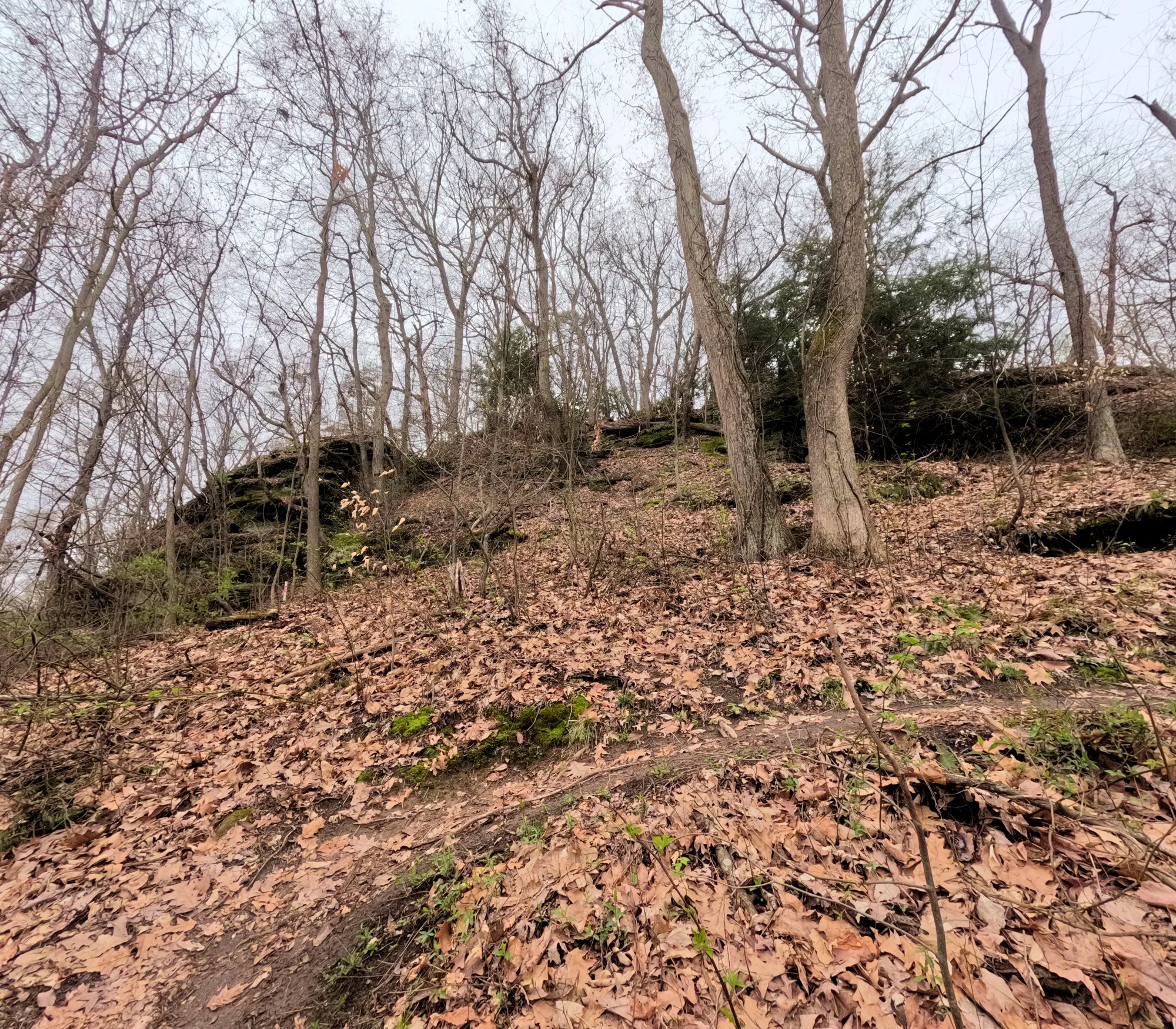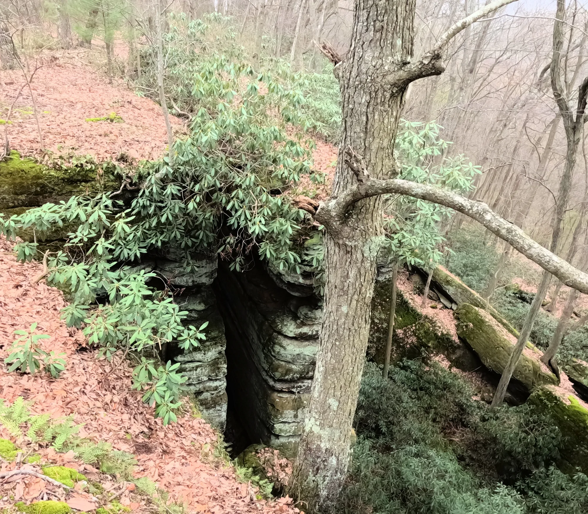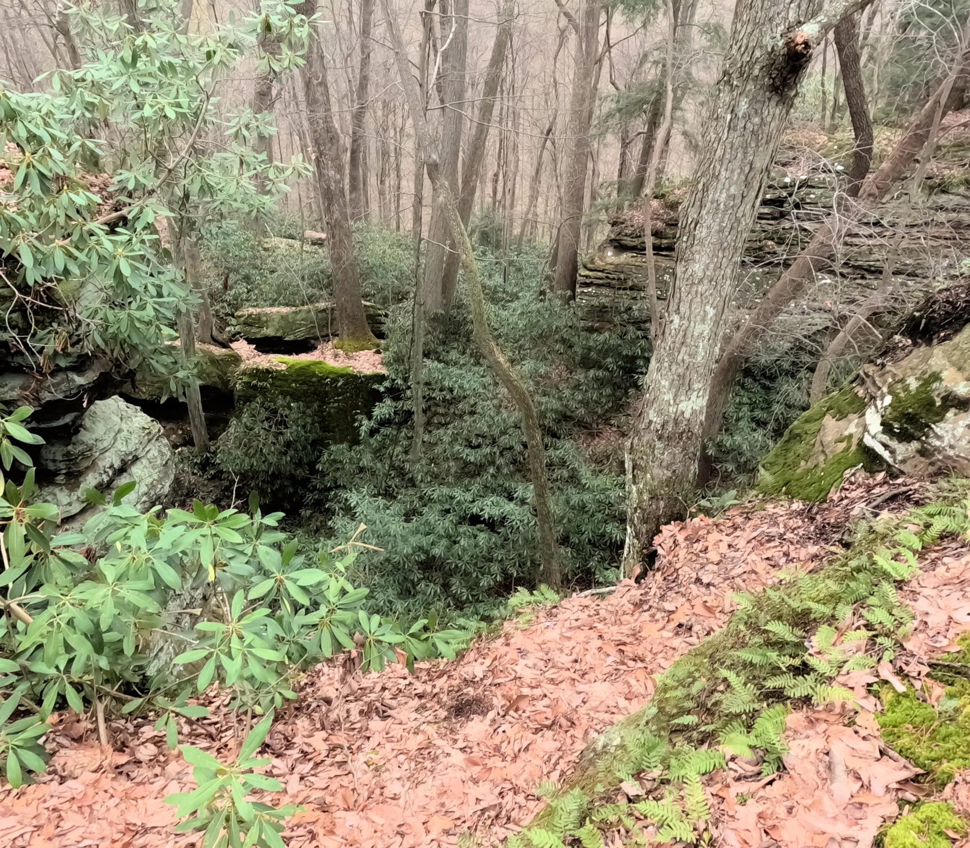 The cooler, north-facing slopes below the cliffs provide an ideal environment for eastern hemlock, black birch, and a state-listed member of the heath family—the great rhododendron (Rhododendron maximum). This area likely hosts the largest native population of this rhododendron in Ohio. The peak blooming period usually occurs in late June to early July.