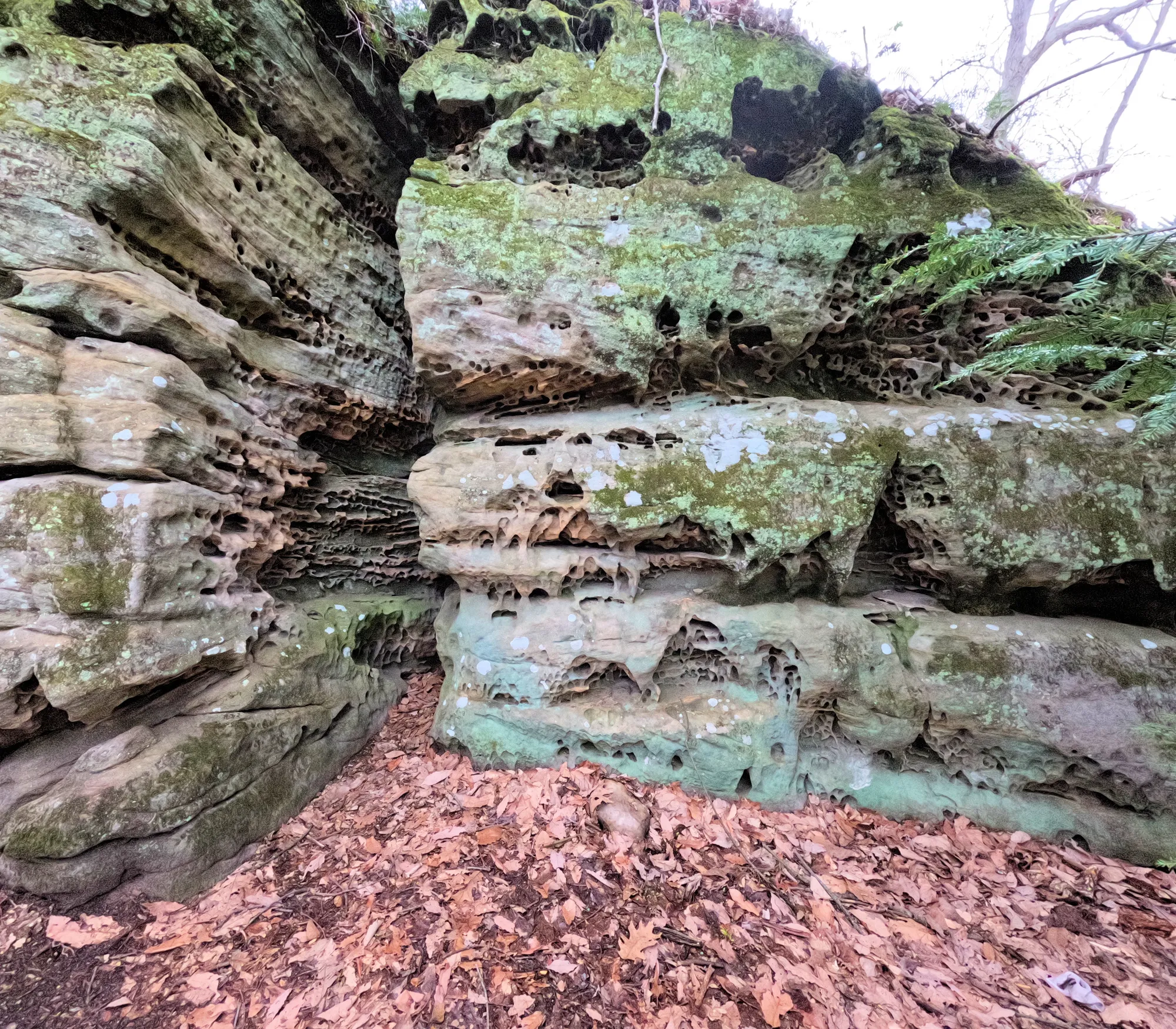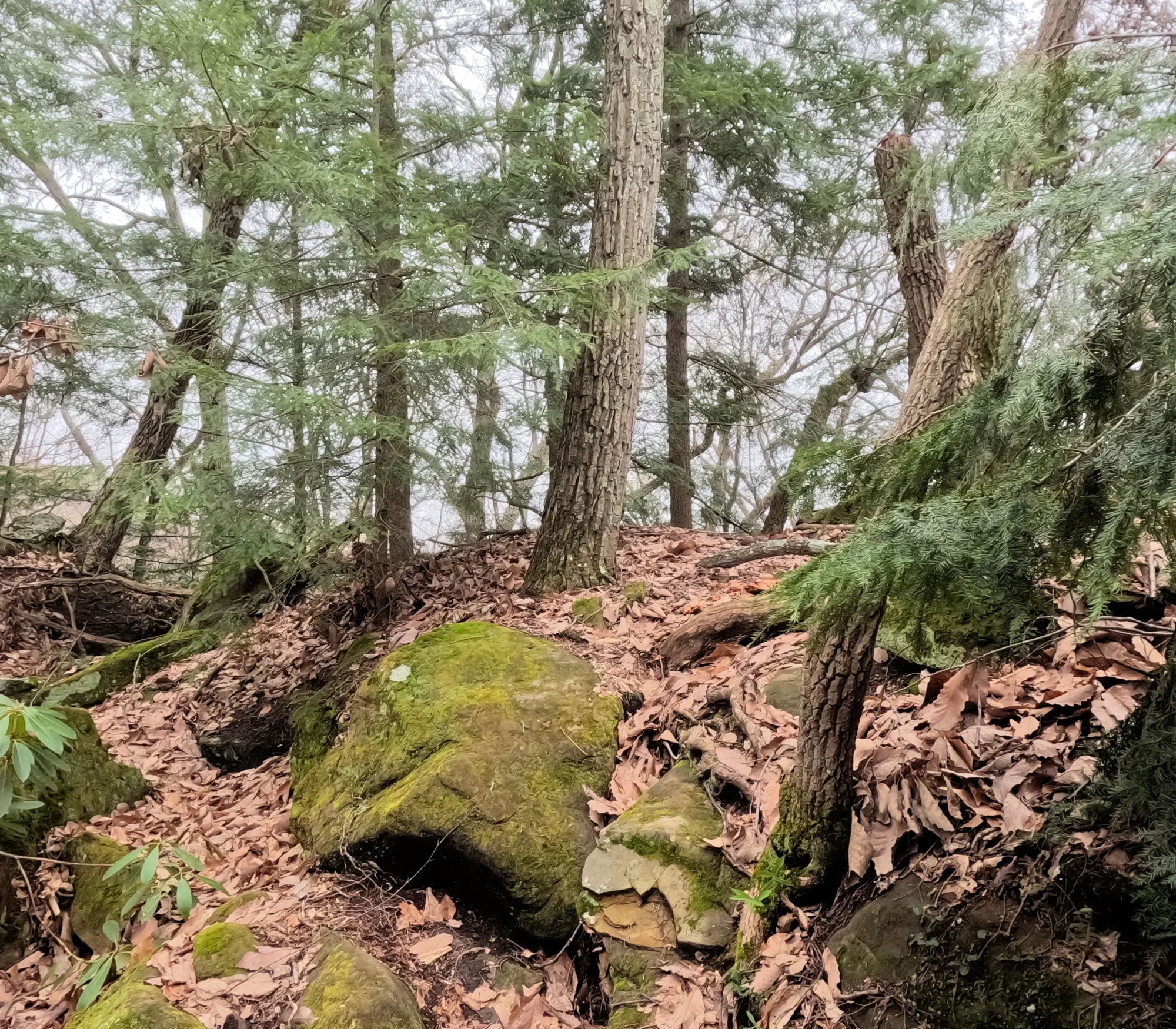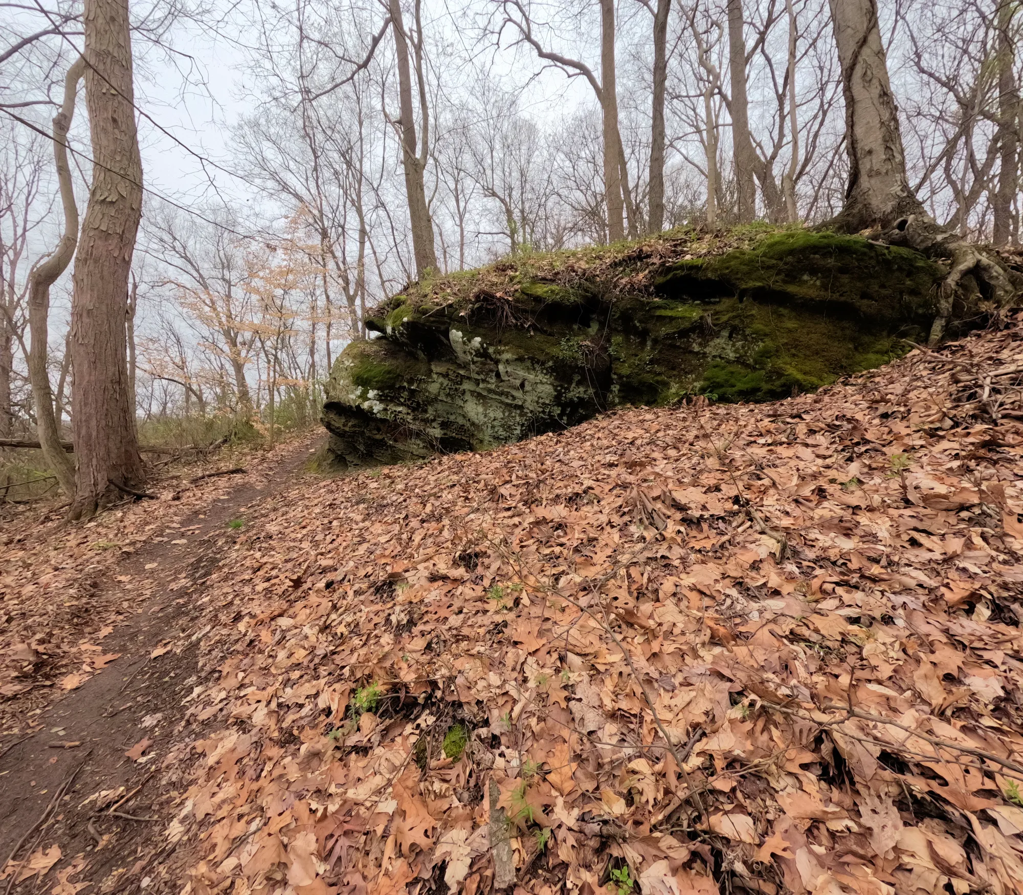 The cooler, north-facing slopes below the cliffs provide an ideal environment for eastern hemlock, black birch, and a state-listed member of the heath family—the great rhododendron (Rhododendron maximum). This area likely hosts the largest native population of this rhododendron in Ohio. The peak blooming period usually occurs in late June to early July.