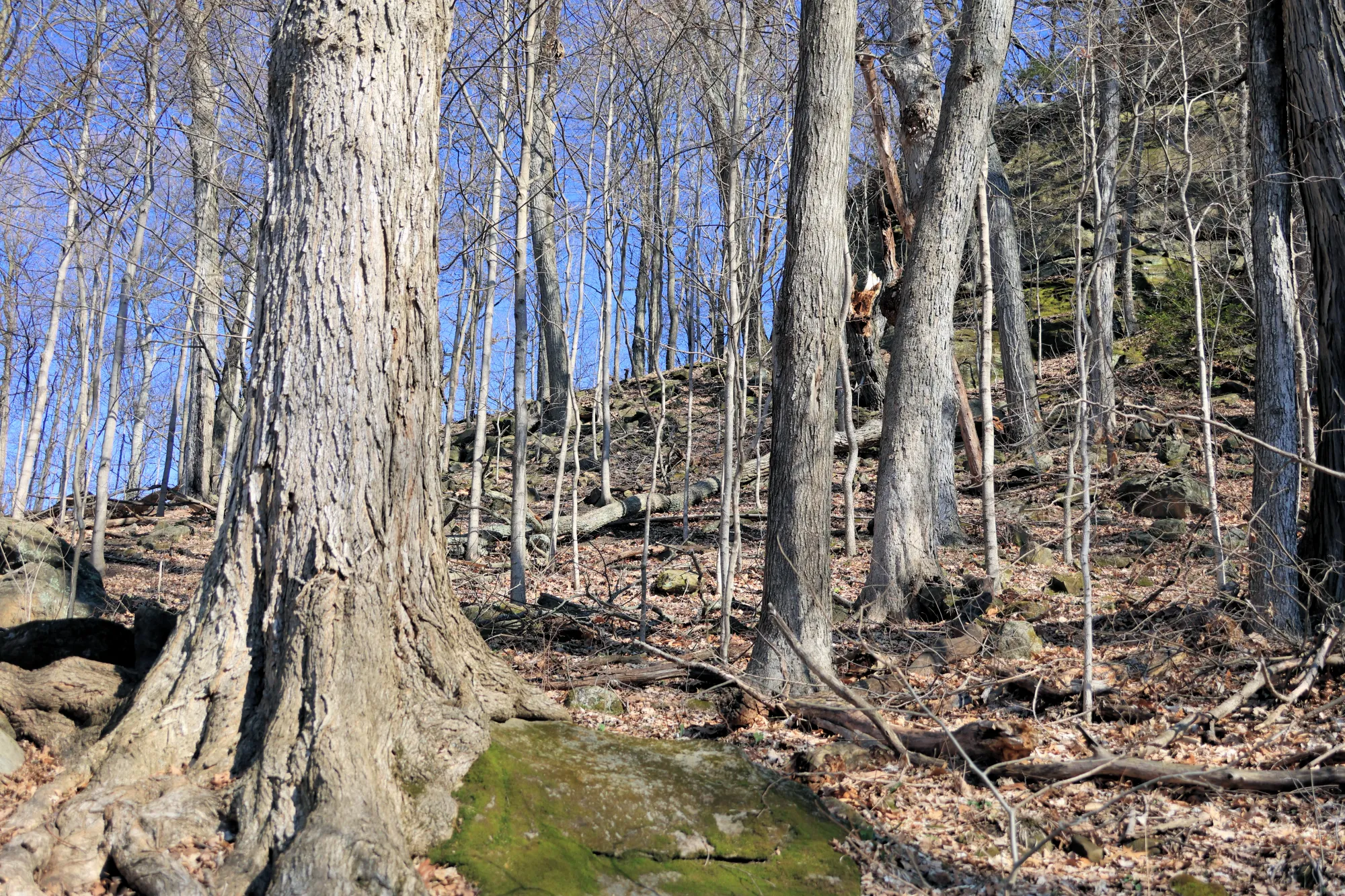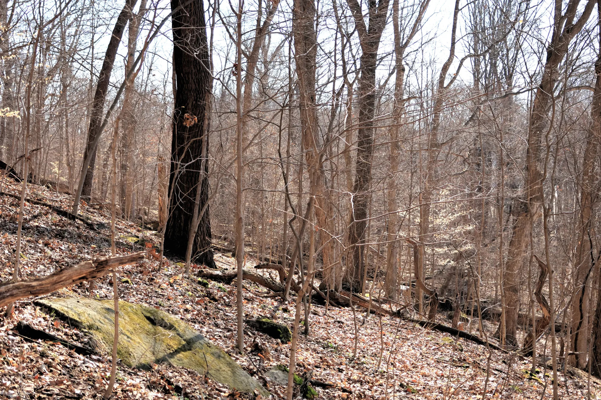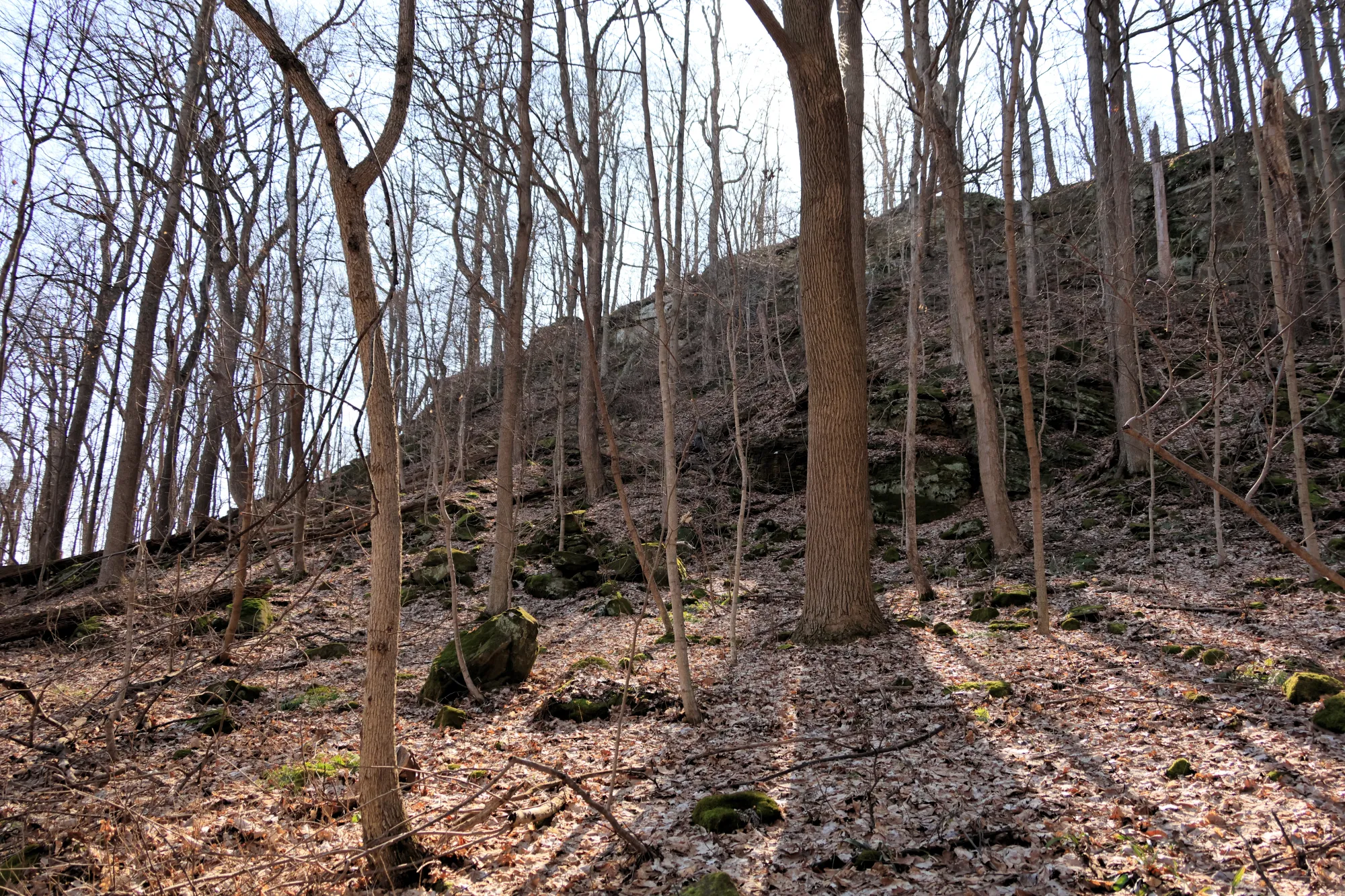 At Shallenberger, these forces shaped Allen Knob, a 240-foot sandstone peak with sweeping views of the central Ohio plains, and the smaller Ruble Knob. The landscape also shows signs of the last ice age, when glaciers over a mile thick reached just northwest of here. While the tops of the knobs likely stayed ice-free, their bases were buried under glacial debris called an end moraine. The thin, rocky, nutrient-poor soils atop the knobs support plants like chestnut oak, mountain laurel, and ferns such as polypody, ebony spleenwort, and walking fern—species more common in the Appalachians—while few other woody plants manage to grow there.