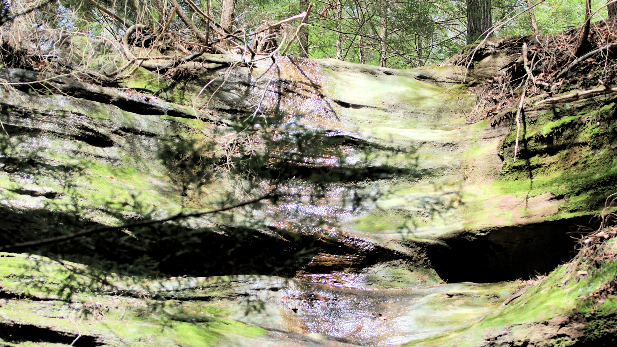 Whispering Cave is a spectacular geologic formation. It is approximately 300 ft. wide and 100 ft tall. The cave is located within Hocking Hills State Park, Ohio. It opened for more public access in 2017 with the Hemlock Bridge Trail system. It is considered the second-largest recess cave in the Hocking Hills region behind Ash Cave. A seasonal waterfall cascades from the ledge above the cave — around 100+ feet tall when it’s flowing.