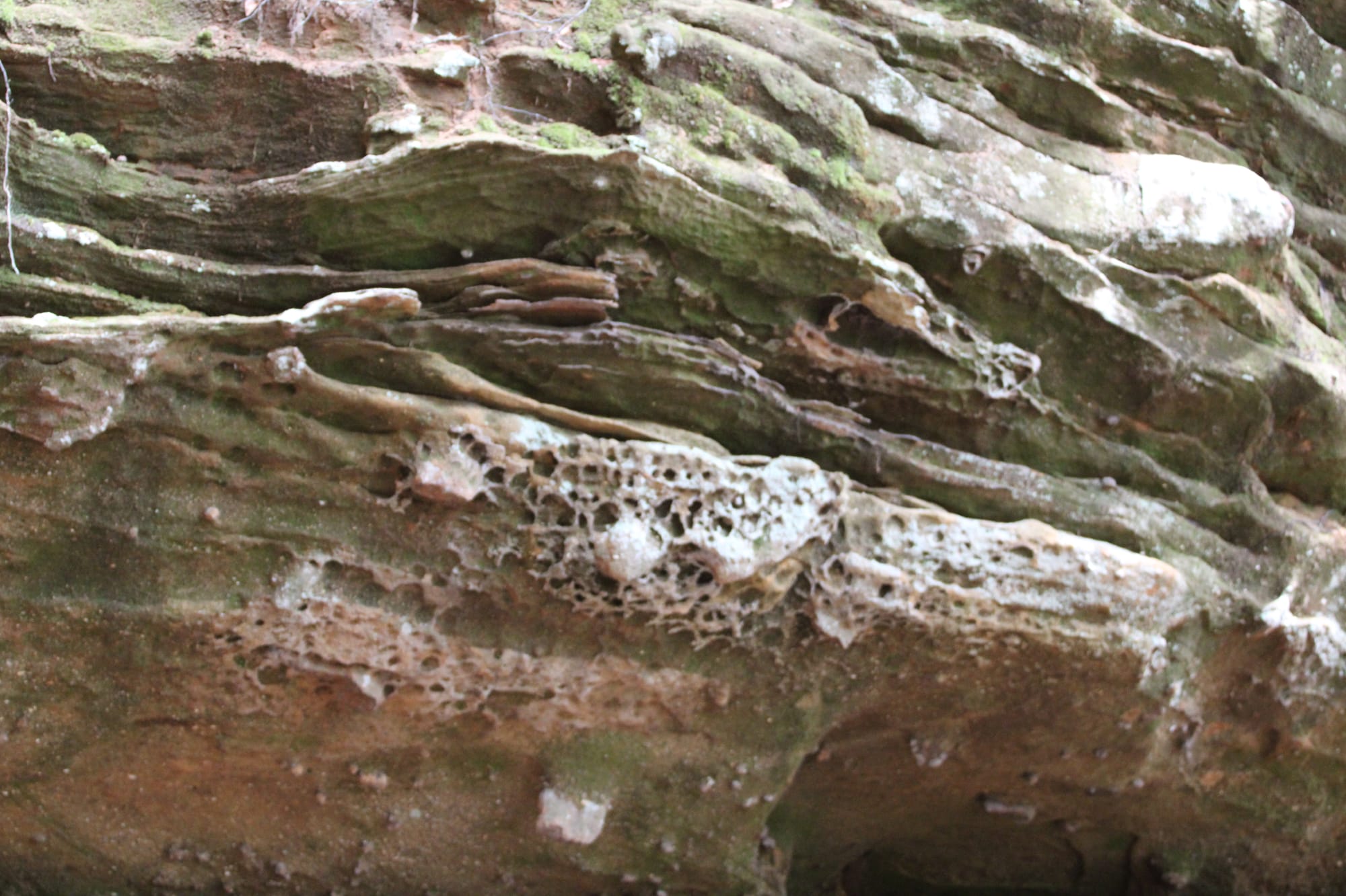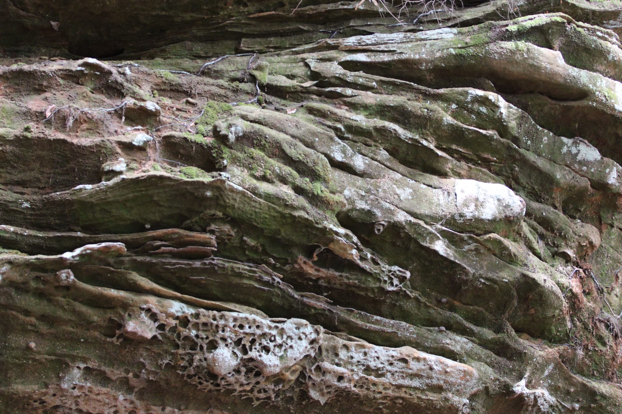 Whispering Cave is a recess cave formed in the Hocking Hills region’s characteristic “Black Hand” sandstone by erosion of the softer middle layer, leaving the over-hanging ledge and cave space beneath. It lies within the broader Hocking Hills region whose park lands began state acquisition in the 1920s.